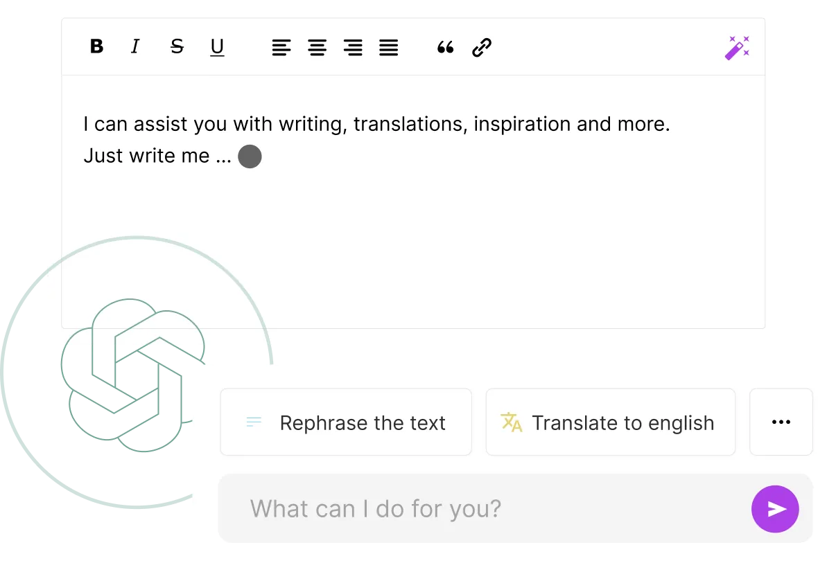 Nutzen Sie den KI-Assistenten von KAB Page. Lassen Sie Ihre Seiten automatisch von der KI ausfüllen oder Ihre Texte umschreiben und übersetzen.